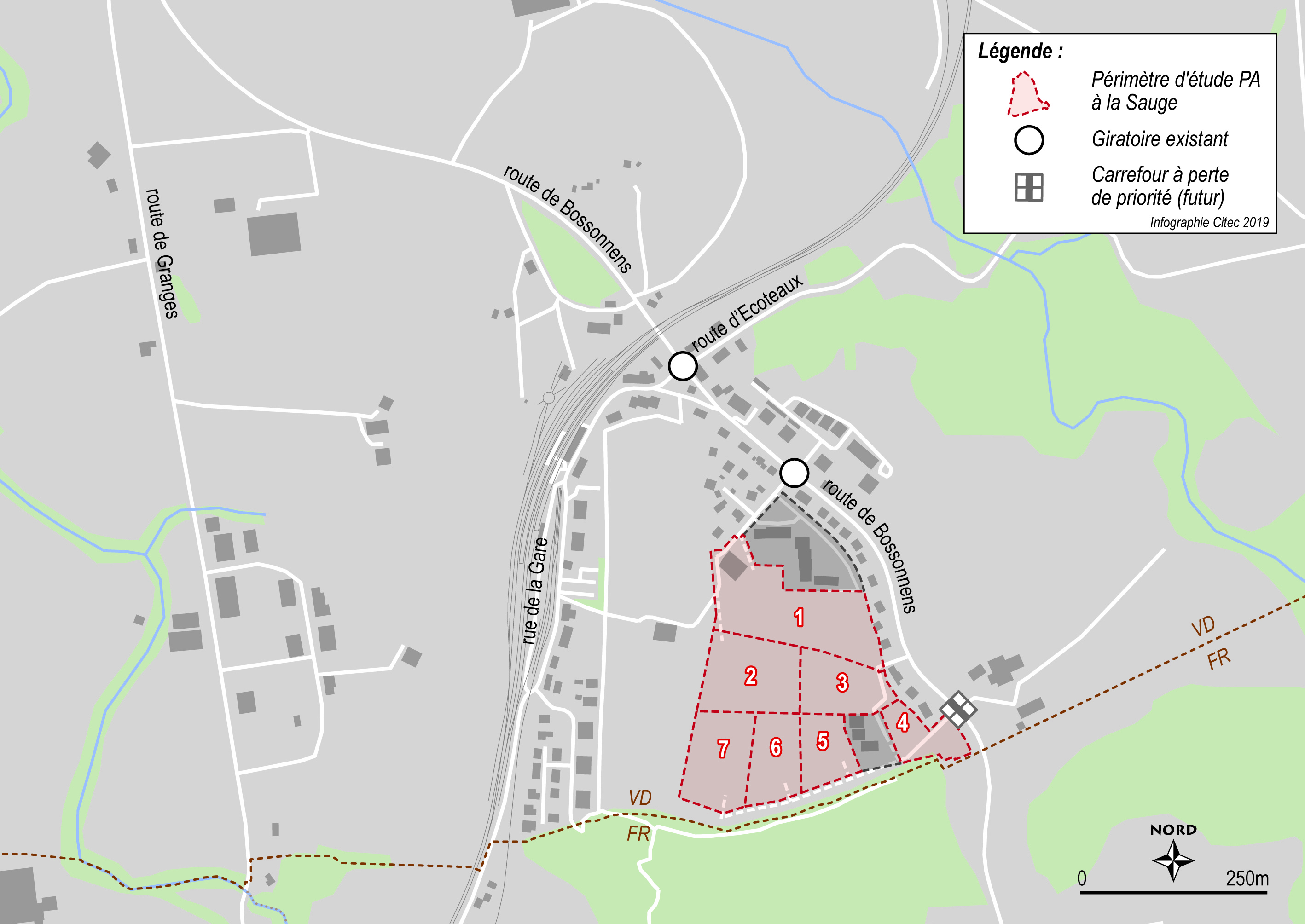 Le site « À la Sauge », situé à Palézieux-Gare sur la commune d’Oron, va faire l’objet d’une importante densification ces vingt prochaines années. Le plan de quartier initialement développé a dû être adapté suite à l’entrée en vigueur depuis le 1er mai 2014 de la nouvelle loi sur l’aménagement du territoire pour rester sur la parcelle 340 uniquement, en zone à bâtir. Ainsi, le projet a été redimensionné à la baisse pour accueillir environ 1’100 habitants.