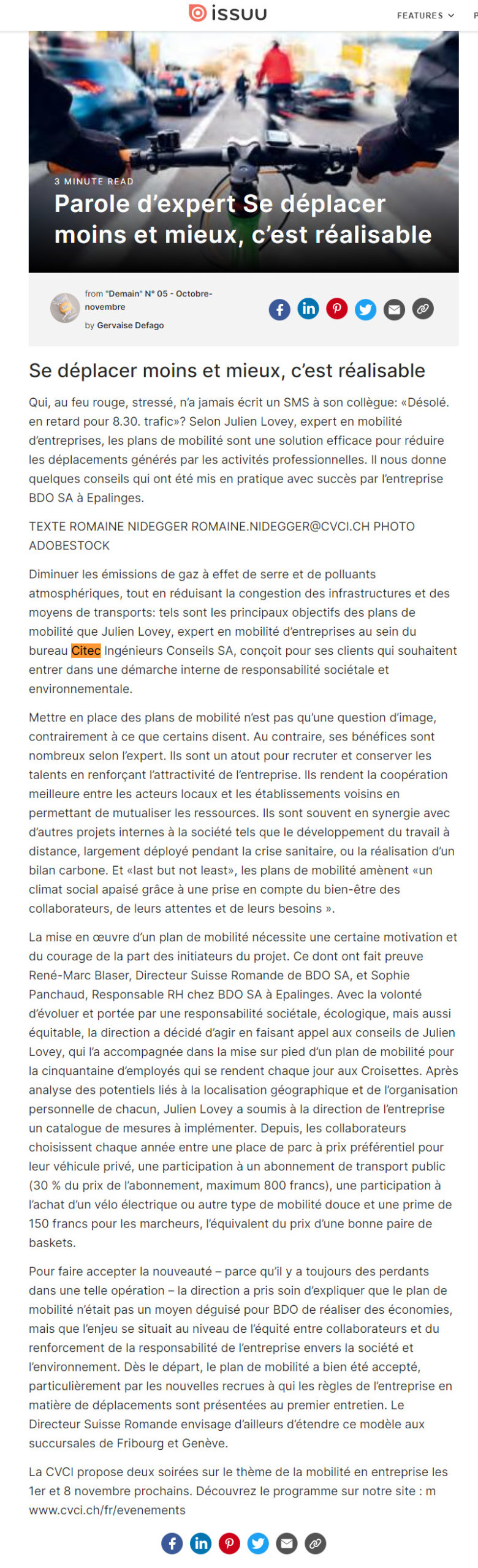 23 octobre 2025En savoir plusREPLAY — Le 23 septembre 2025, Citec a participé au webinaire « Cité de l’énergie à midi » consacré aux nouveaux standards MMS pour les plans de mobilité. Découvrez le replay et la présentation animée par Julien Lovey, expert Citec et membre fondateur de MMS.